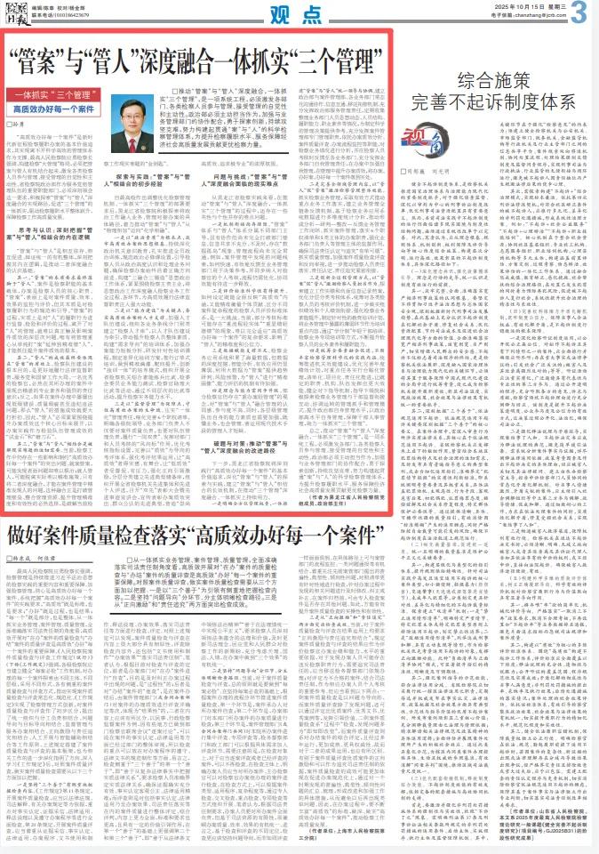 推动“管案”与“管人”深度融合,一体抓实“三个管理”,是一项系统工程,必须激发各部门、各类检察人员参与管理、接受管理的自觉性和主动性。政治部必须主动担当作为,加强与业务管理部门的协作配合,勇于探索创新,持续攻坚克难,努力构建起贯通“案”与“人”的科学检察管理体系,为提升检察履职水平、服务保障经济社会高质量发展贡献更优检察力量。